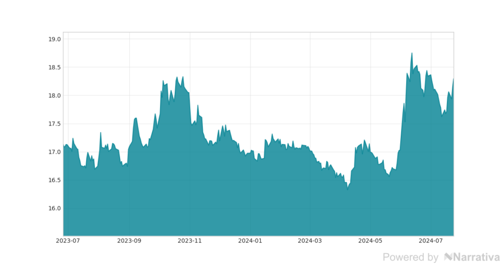 Durante el cierre de mercados de este miércoles, 24 de julio de 2024, el dólar alcanzó los MXN 18.37, cifra que refleja una variación de la moneda del 1.22% en comparación con su precio en la sesión de apertura.