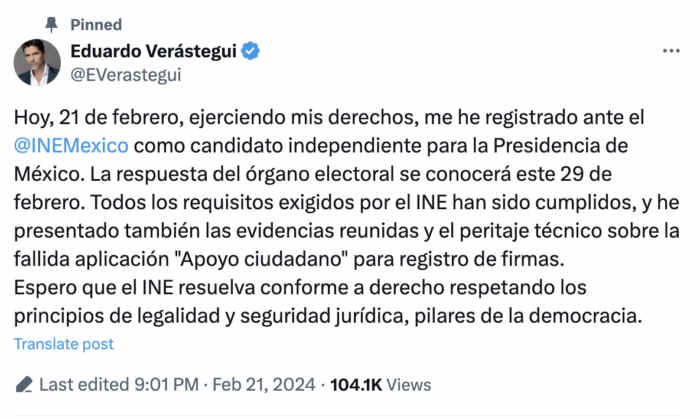 A través de una publicación en la red social ‘X’, el aspirante a la máxima responsabilidad pública compartió que fue este 21 de febrero que se presentó ante el INE para registrarse como candidato independiente; de igual forma, aseguró que “todos los requisitos exigidos por el INE han sido cumplidos”.