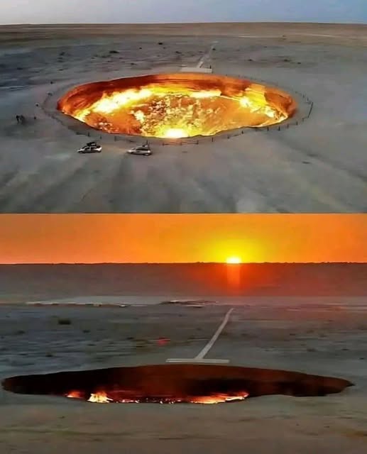 El cráter de Darvaza, a menudo conocido como la “Puerta del Infierno”, es un cráter ardiente masivo ubicado en el desierto de Karakum de Turkmenistán. Fue creado en 1971 cuando los geólogos soviéticos perforaron accidentalmente en una cueva subterránea llena de gas natural, haciendo que el suelo se derrumbe.