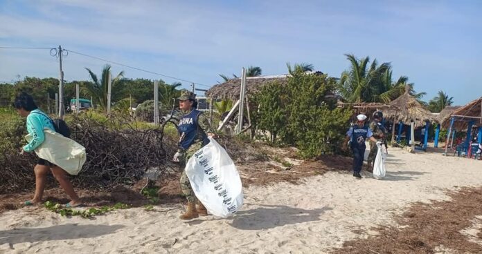 Chabihau, Yobaín, 23 de marzo.- En el marco del Programa de Saneamiento de Playas y Manglares de Yucatán, elementos de la Secretaría de Marina, la Secretaría de Desarrollo Sustentable, el Ayuntamiento de Yobaín y voluntarios recolectaron un total de 259 kilogramos de desechos sólidos inorgánicos contaminantes.