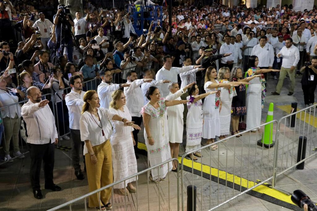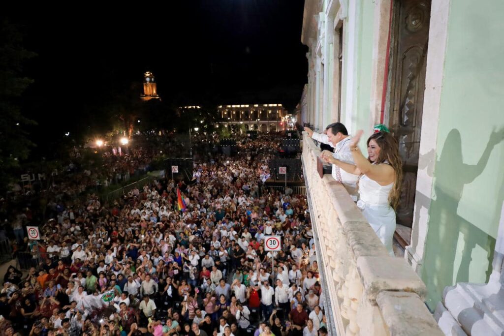 Ante más de 50 mil personas, el Gobernador de Yucatán encabeza la fiesta del pueblo en la Plaza Grande y lanza un emotivo mensaje desde el Balcón Central de Palacio de Gobierno. – “A nombre de mi familia, a nombre de todos nosotros, les decimos; gracias, Yucatán. Vamos juntos a trabajar por el Renacimiento Maya”.