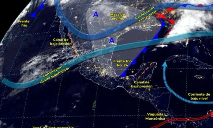 La masa de aire frío asociada al frente frío No. 24 provocará temperaturas frías a muy frías en diversas regiones, especialmente durante la noche y madrugada del domingo. Las zonas altas de los estados del noroeste, norte, noreste, occidente, oriente y centro de México experimentarán un ambiente gélido.