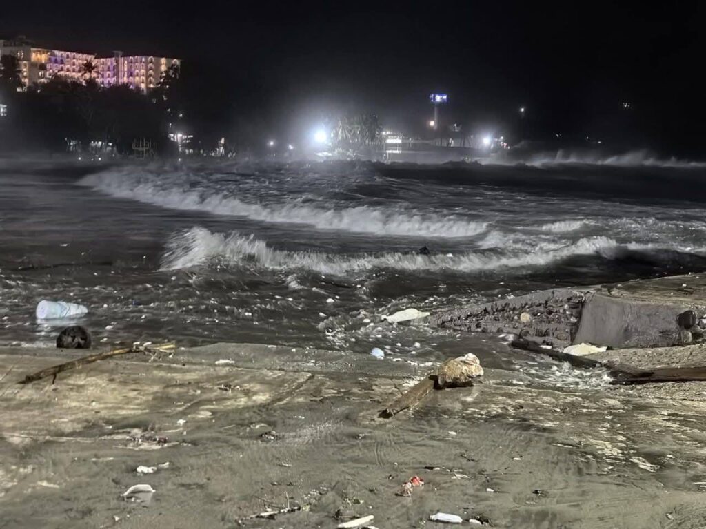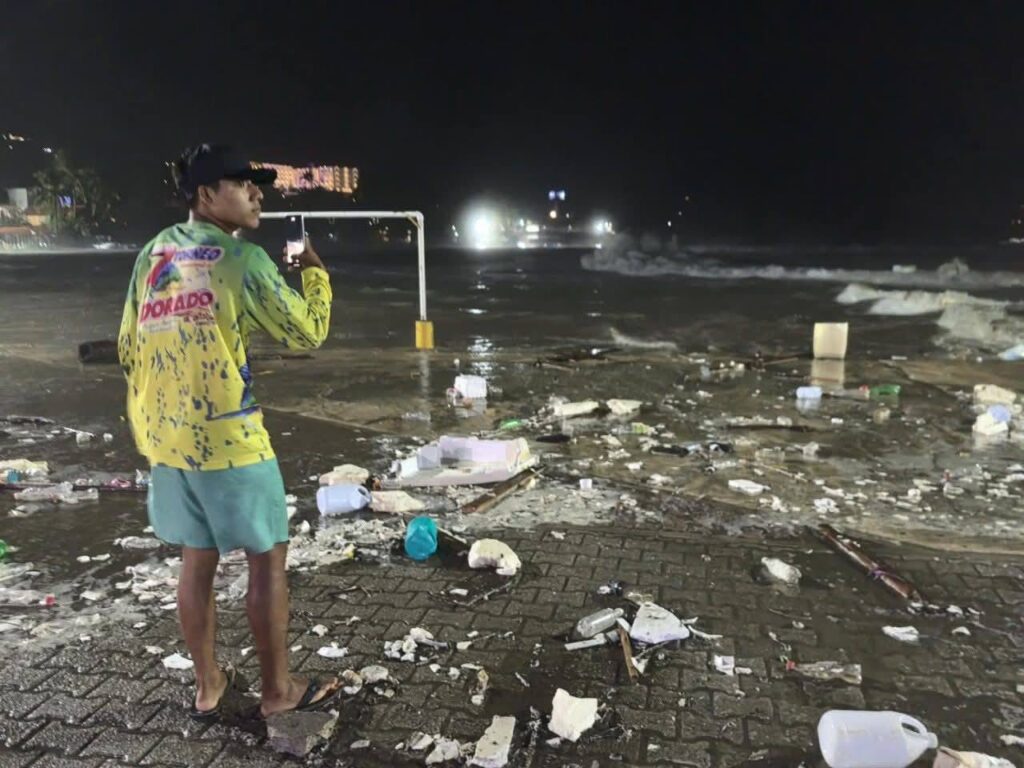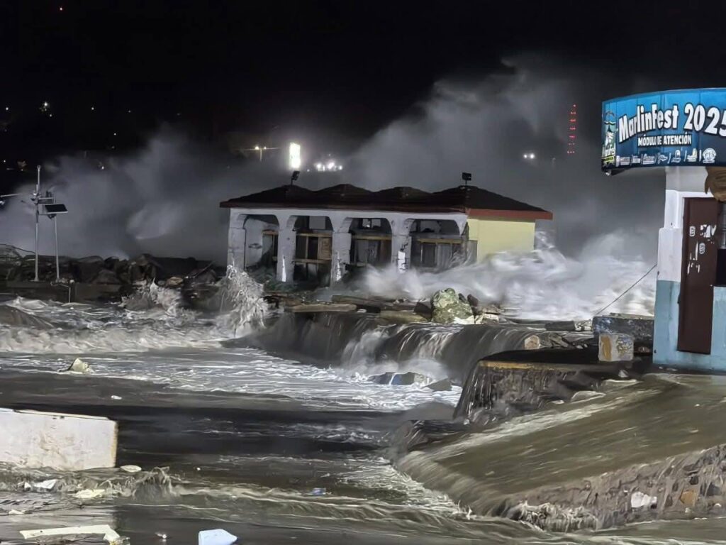 A través de redes sociales se compartieron fotos y videos de las fuertes olas que durante la noche impactaron Puerto Escondido e incluso se reportó que quedó destruida la estatua del pez vela, símbolo de la práctica deportiva que se realiza en la zona.