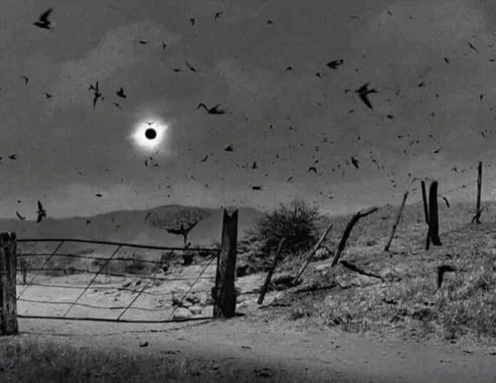 Su poderosa imagen muestra la corona del Sol iluminando un cielo misterioso y oscurecido, mientras bandadas de pájaros desorientados reaccionan ante la repentina noche. Una valla rústica y un camino solitario en primer plano añaden una atmósfera inquietante y surrealista a este raro evento celestial.