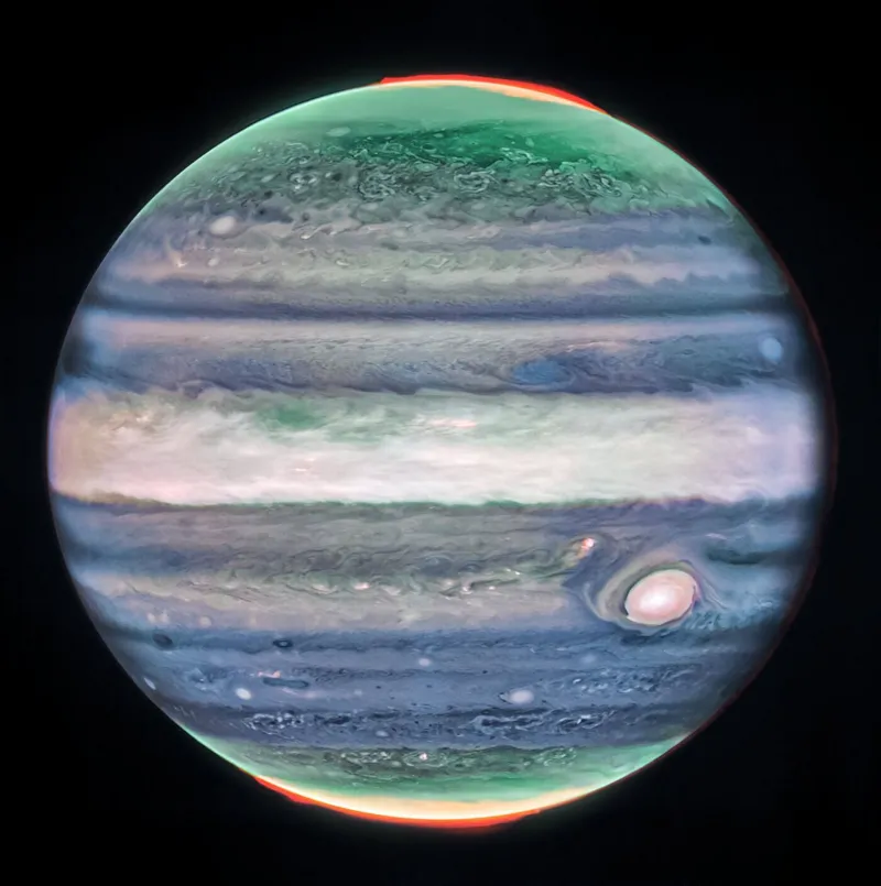JÚPITER | El planeta más grande del Sistema Solar, Júpiter, visto en luz infrarroja. En la imagen, las partes más brillantes aparecen en las altitudes más altas: las cimas de las nubes de tormenta convectivas.