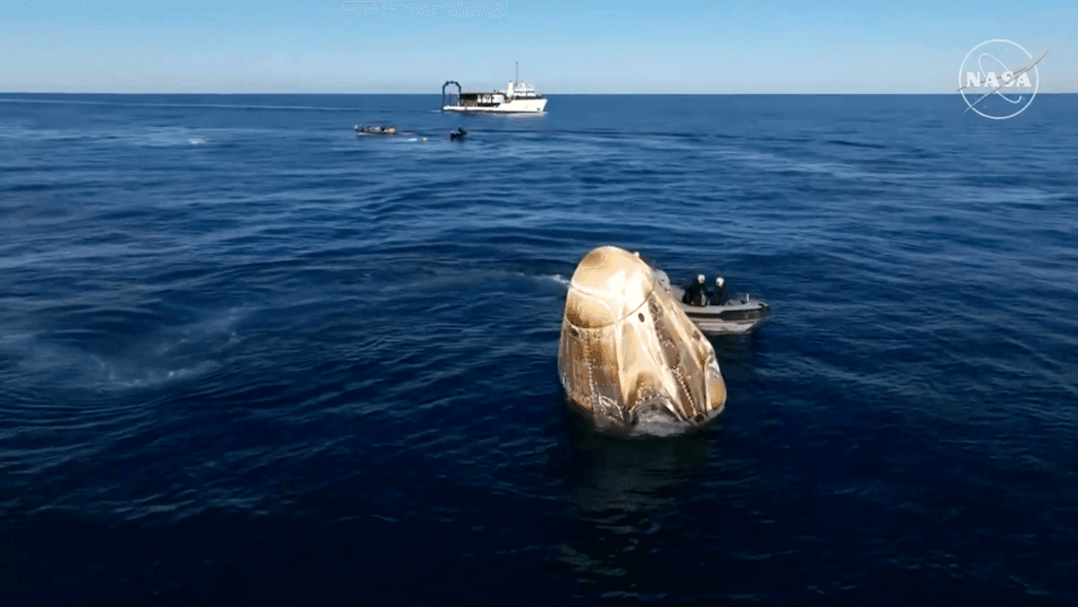 “En nombre de SpaceX, bienvenidos a casa”, anunció por radio el Centro de Control de Misión de SpaceX en California mientras los aplausos estallaban en la sala de control y la cápsula aterrizó.