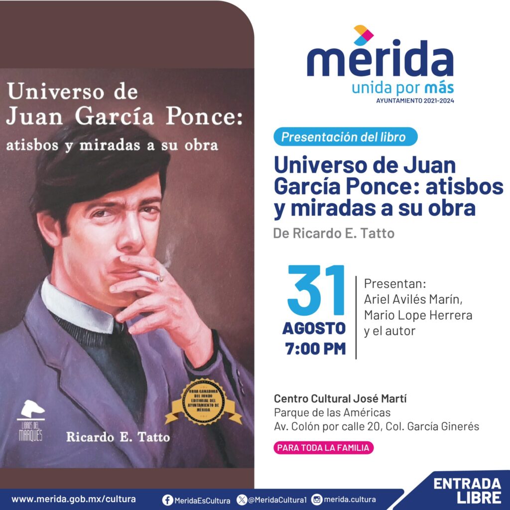 Ahora toca el turno de Mérida, ciudad natal del autor y del propio García Ponce, el sábado 31 de agosto a las 7 PM en el Centro Cultural José Martí del Parque de las Américas, teniendo como presentadores al ensayista Mario Lope Herrera y al periodista cultural y cronista Ariel Avilés Marín. Al finalizar la presentación, habrá venta y firma de libros, así como un brindis de honor para todos los asistentes.