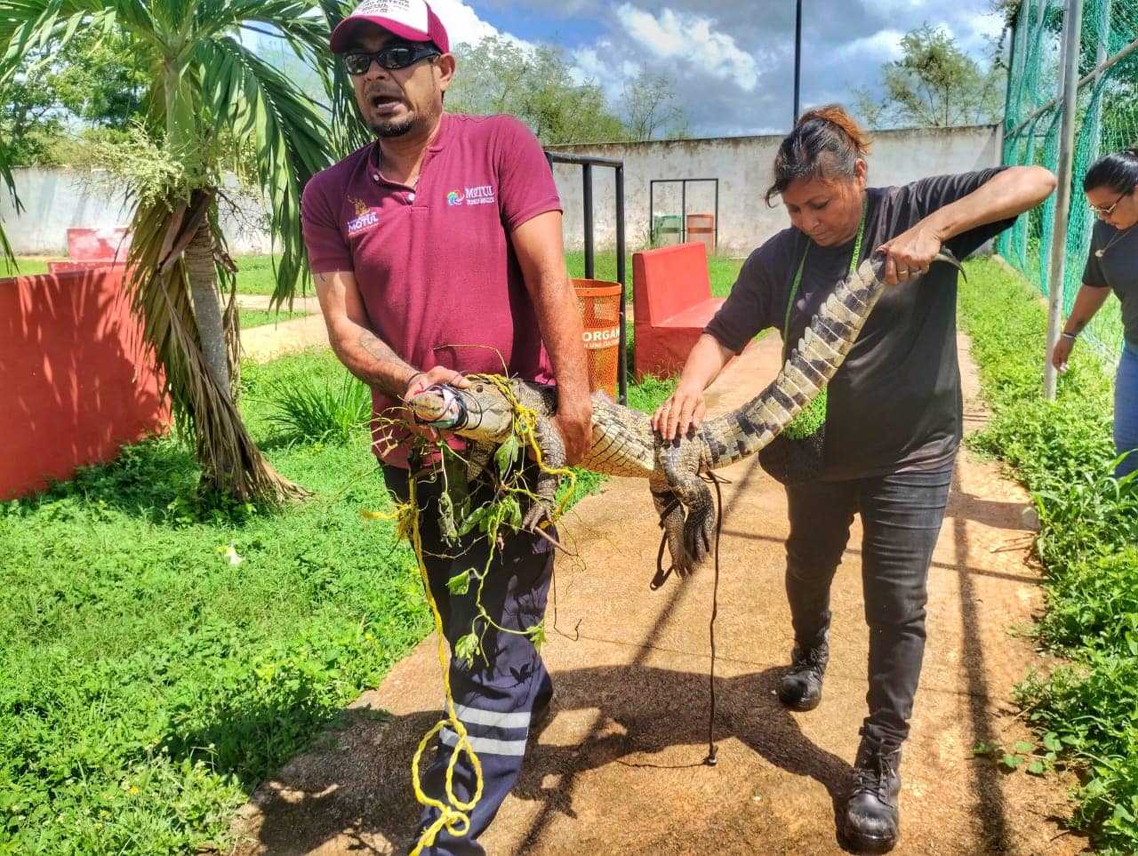 Un cocodrilo de aproximadamente 1.30 metros fue encontrado en el patio de una vivienda ubicada en la calle 21 por 38, junto al fraccionamiento La Herradura.