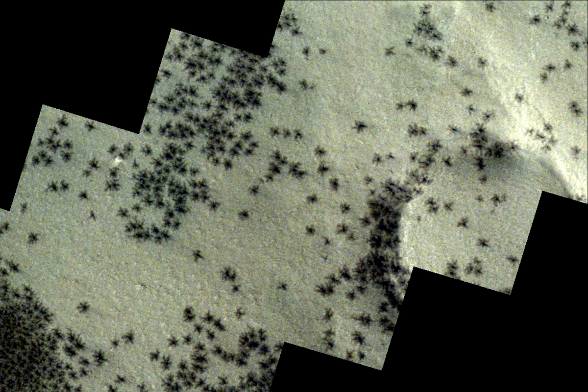Sin embargo esta imagen poco tiene que ver con artrópodos o con signos ortográficos. Se trata de formaciones geológicas naturales causadas por la llegada de la primavera a la región polar del sur del planeta vecino.