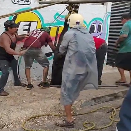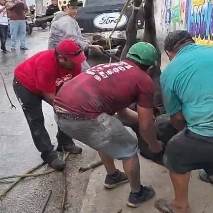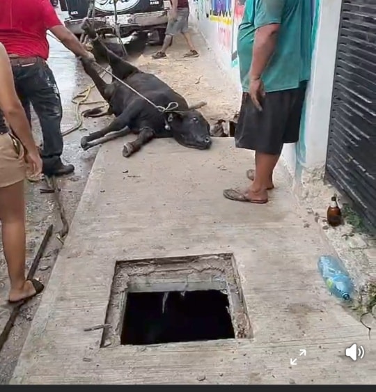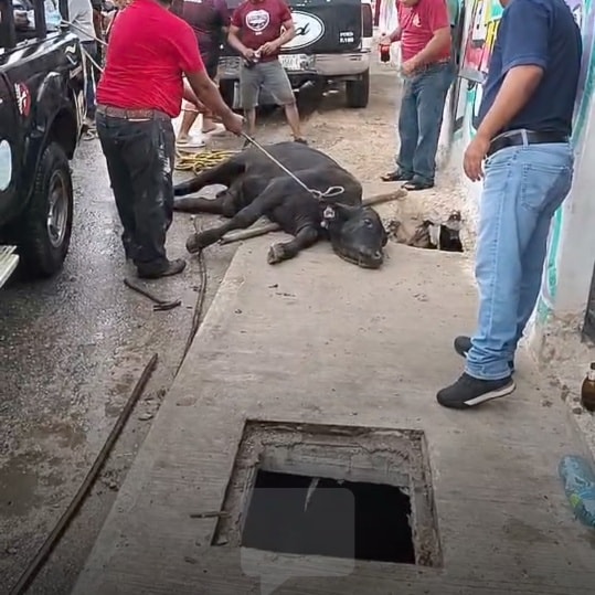 Tizimín, Yucatán, 10 de junio de 2025.– Momentos de tensión se vivieron en las inmediaciones de la plaza de toros de Tizimín, luego de que un toro de aproximadamente 200 kilos, conocido como “Azabache”, cayera y quedara atorado en una línea de registro subterránea ubicada sobre la calle 44 por 45 y 47 de Tizimín.