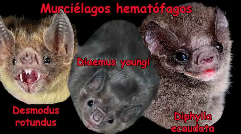 Sin embargo, los que más llaman la atención, son los que se alimentan de sangre (hematófagos). Estos animales muerden a su víctima, que generalmente es otro mamífero, y vierten sustancias que reducen el dolor y sustancias anticoagulantes que contienen en su saliva. Mientras la herida sangra, ellos lamen la sangre. Pueden obtener hasta 20 ml de sangre por comida. Existen 3 especies de murciélagos hematófagos: el “vampiro común” (Desmodus rotundus), el de patas peludas que, además, no tiene cola (Diphylla ecaudata) y el de alas blancas (Diaemus youngi).