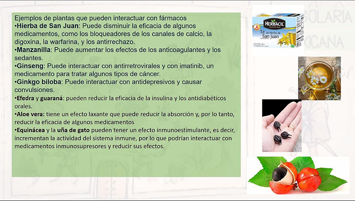 Por ejemplo, la hierba de San Juan puede disminuir la eficacia de algunos medicamentos; la manzanilla es capaz de aumentar el efecto de sedantes; el ginseng bloquea efectos antirretrovirales de fármacos y combinado con antidepresivos puede causar convulsiones; el acuyo es tóxico cuando se combina con ansiolíticos, además es capaz de potenciar los efectos de sedantes; el ajo tiene capacidad anticoagulante y no es recomendable comerlo antes de cirugía.